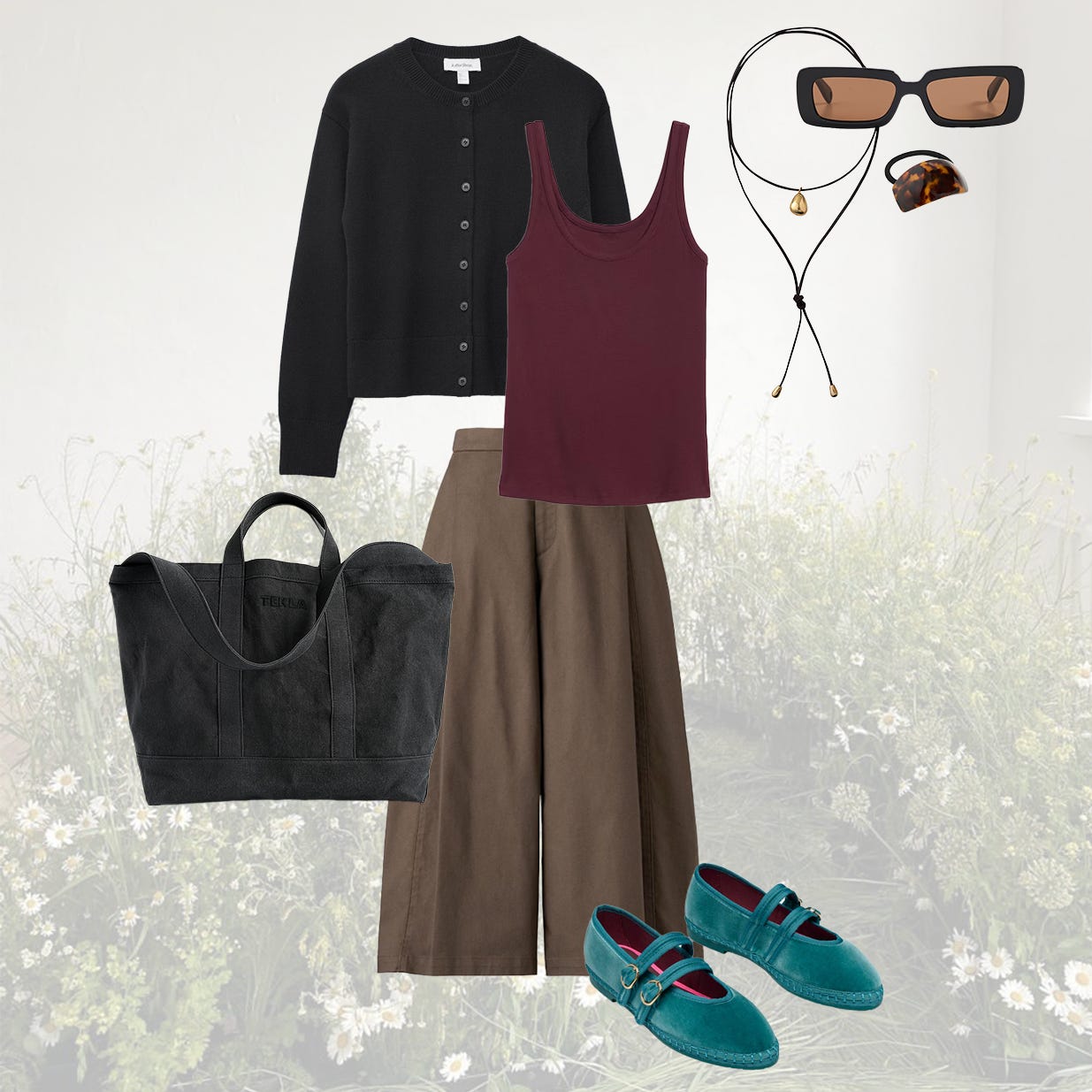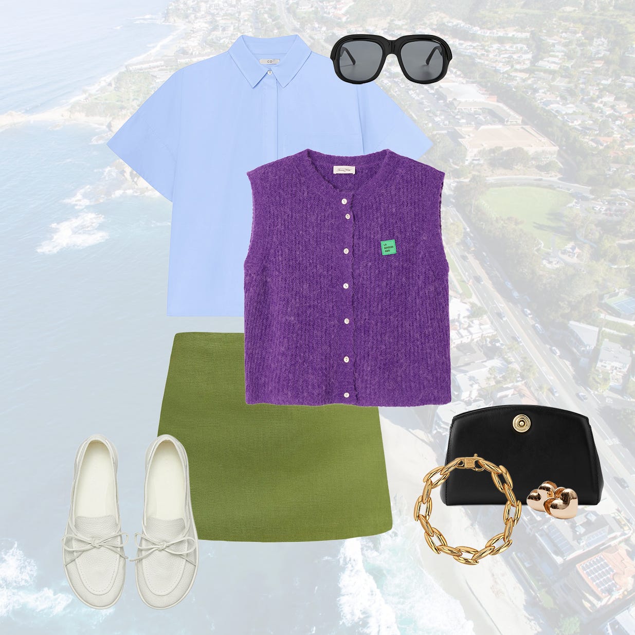 Most people would reserve green and purple for Halloween. Think Daphne from Scooby Doo and nothing else. And yet. On the right day, in the right proportions, it feels electric. Keep the sunnies, loafers, and clutch neutral.