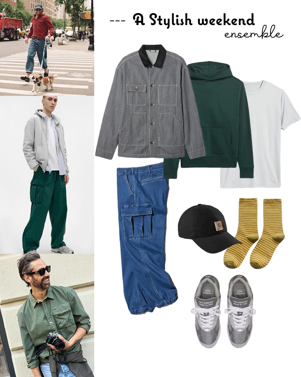 This weekend ensemble is all about comfort and style. The Gap Railroad Denim Chore Jacket adds edge. At the same time, add an Old Navy Rotation Pullover Hoodie and an Old Navy CloudMotion T-Shirt (made of sweat-wicking material) both are perfect for layering. Uniqlo Wide Cargo Denim offers pockets and versatility, and New Balance 993 Sneakers ensure all-day comfort. For a playful touch, top it off with a Carhartt Canvas Cap and fun stripe socks. Easily layer up or down for all your weekend adventures.