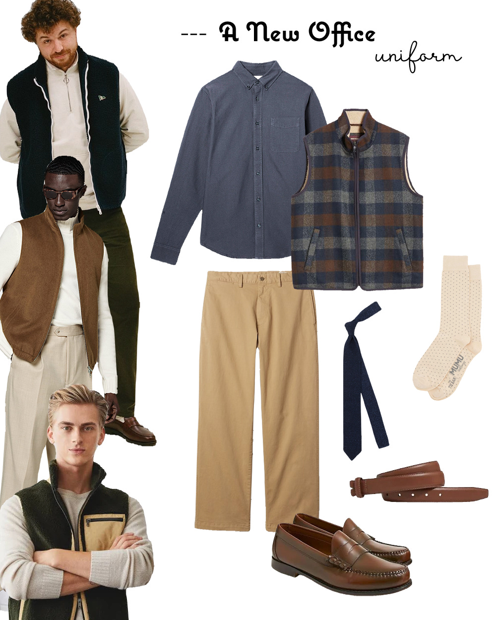This work outfit offers a blend of comfort and a polished appearance. Everlane The Classic Oxford Shirt delivers a sharp, timeless look, while the Gap '90s Loose Khakis provide ease of movement. The standout Johnston & Murphy Fleece Lined Felted Check Vest adds a layer of warmth and a bit of character. You can dress it up with a Tilebar Lakeshore Knit Denim Blue Tie, a J.Crew Factory Classic Dress Belt, and J.Crew Factory Penny Loafers, or keep it casual with slip-on sneakers. A pair of Mumu Weddings - Seaside Dot Champagne Socks in a classic pattern adds a touch of personality without being over the top. This combination keeps you looking sharp while feeling comfortable throughout the day, just like those pairs of cargo shorts.