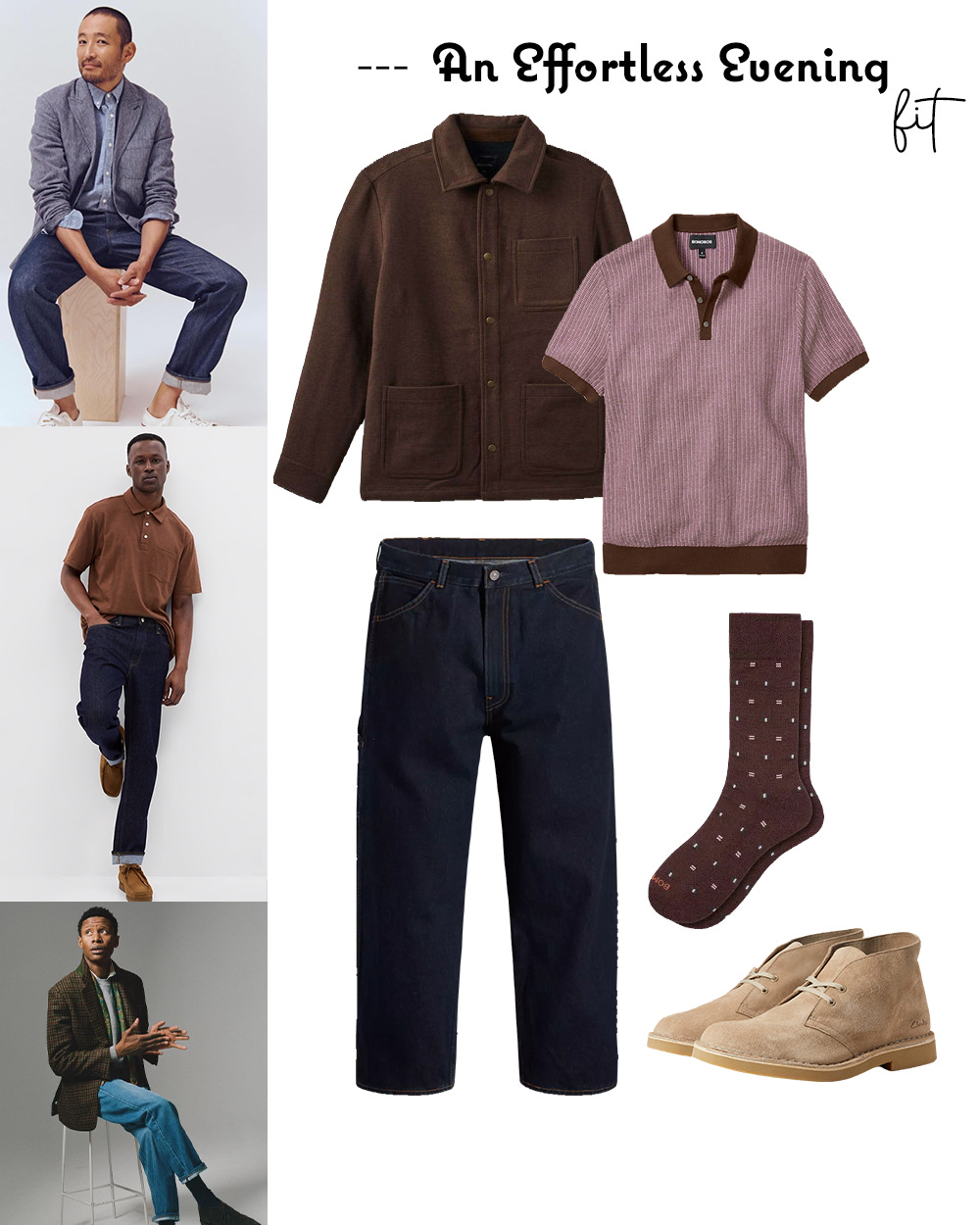 Layering a textured Brixton Menswear Chore Coat adds sophistication and warmth, making it perfect for cooler evenings. Comfortable Clarks Desert Boot Evo round out the look, providing both style and ease for a night out. And last but certainly not least, grab Bombas Geo Dress Calf Socks to inject a fun surprise into the outfit. This combination strikes a perfect balance between casual and polished, ideal for any evening occasion.