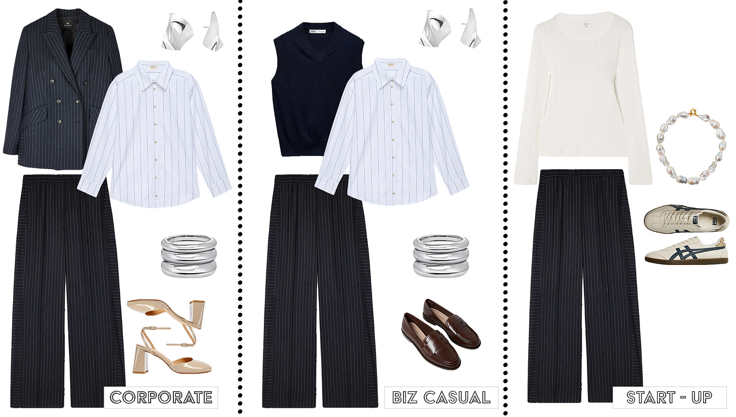 For the ultimate "start-up" guru vibe, keep it minimal yet effortlessly cool with a few standout pieces. Start with the Paul Smith navy pinstripe wide-leg trousers, and skip the button-down and vest in favor of the LESET Pointelle Long Sleeve, which still brings in stripes but with a modern textured twist. Ditch your traditional office footwear for the Onitsuka Tiger Tokuten Sneakers, offering chic, casual comfort. For accessories, keep it simple yet impactful with an Aurem Seraphine White Freshwater Pearl Necklace, adding a subtle but striking touch. This combination blends ease and style, creating a confident, approachable work-from-anywhere look.
