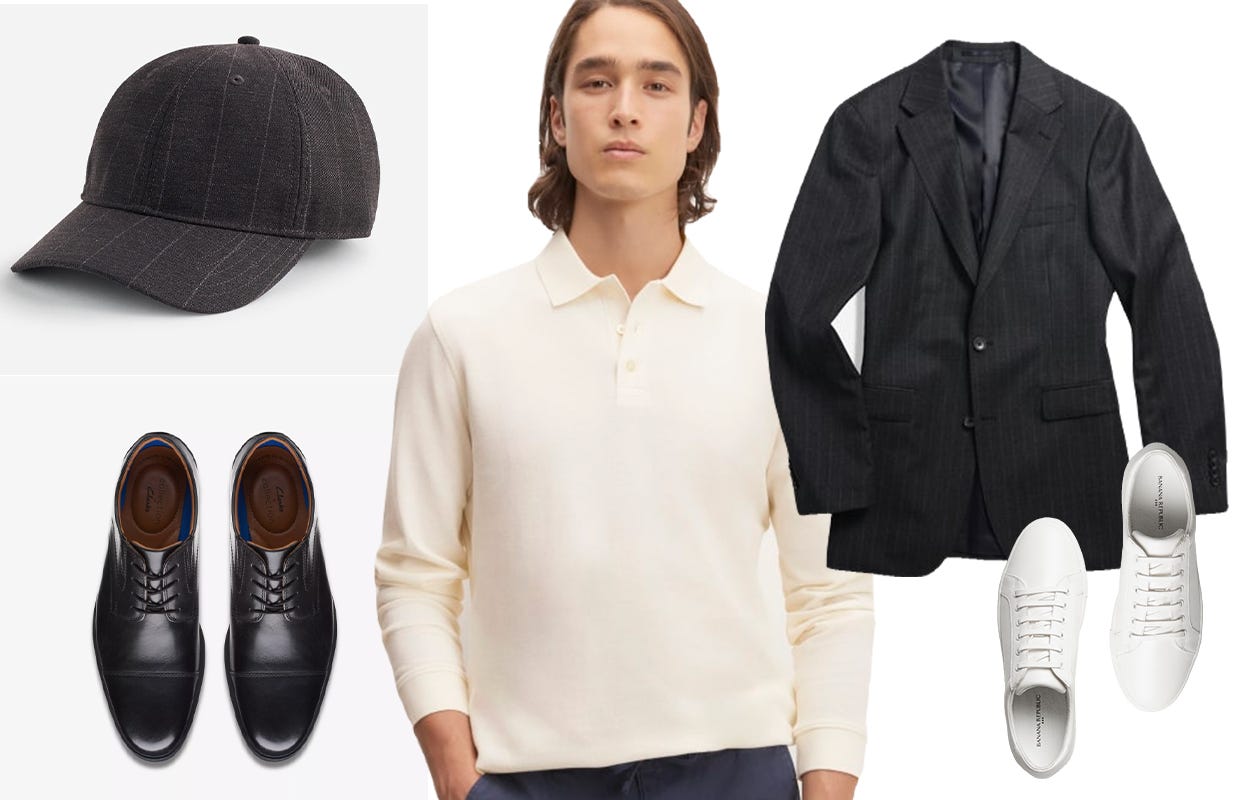 Replicating the Look with More Cost-Effective Choices: Madewell Pinstripe Baseball Hat and Clarks Whiddon Cap Oxfords and Everlane Long Sleeve Pique Polo and Tile Bar Lakeshore Chalk Stripe Charcoal Jacket and Banana Republic Factory Vegan Leather Sneakers.